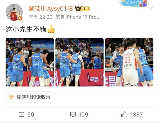 翟晓川社媒晒照片称赞小将张鹏珲