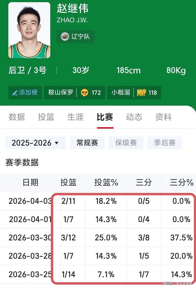 值得一提的是,本场比赛,辽宁队当家球星赵继伟,再一次表现不佳,在进攻端的表现是一塌糊涂。全场比赛,赵继伟出战31分钟,投篮11中2、三分5中0,得到6分4篮板13助攻2抢断。尽管他全场送出13次助攻,很好串联了球队,但他在进攻端,手感实在是太差了。全场11投仅2中,命中率不是2成,三分球更是5中0,包括大空位投篮,也是弹筐而出,真的是“铁”到家了……