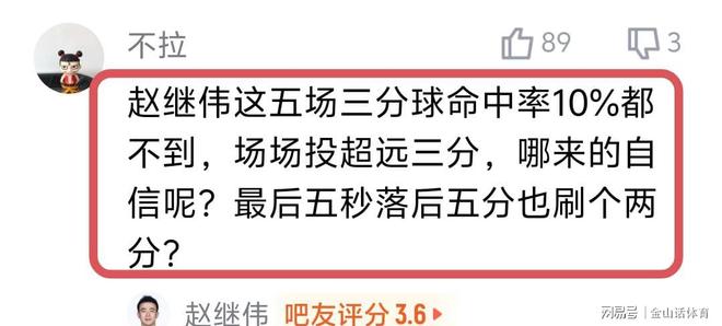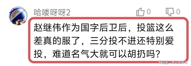 赵继伟糟糕的手感和命中率,也被球迷们纷纷吐槽。“赵继伟这五场三分球命中率15%都不到,场场投超远三分,哪来的自信呢?”;“赵继伟咋啦,现在感觉进攻能力一点没有!”;“赵继伟和王岚钦也不知道怎么了,比赛打着打着投篮技能包丢了,这命中率实在没眼看了!”;“赵继伟作为国字后卫后,投篮这么差真的服了,三分投不进还特别爱投,难道名气大就可以胡扔吗?”……