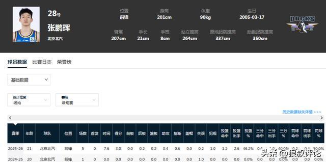 根据CBA官方的公示,张鹏珲今年只有21岁,身高2米01,臂展2米07,助跑起跳摸高350CM。在北京同档次的年轻球员当中,静态条件比较出色。