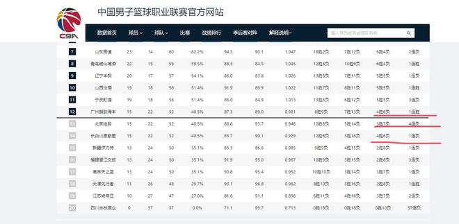 CBA25-26赛季常规赛37轮过后,广州男篮以15胜22负成绩,位居联赛积分榜第12位,刚好卡在季后赛圈边缘,暂时落后第11位宁波男篮4个胜场,与第13名北控、第14名吉林男篮胜场数相同,且领先第15名新疆男篮2个胜场。