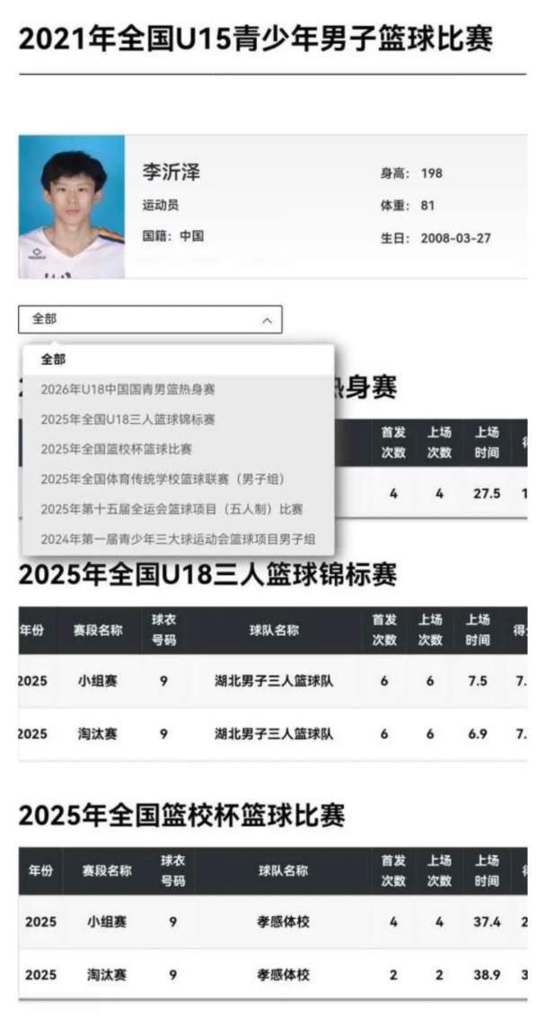 根据官方注册信息,李沂泽登记出生日期为2008年3月27日,现为湖北青年男篮及U18国青队核心球员,2024年代表湖北出战全国青少年三大球运动会。 而此前在2019年全国U15男子预赛中,一名名为张涵泊的球员(注册出生日期为2006年3月19日)代表焦作业余篮校参赛,其外貌、左手投篮习惯、颈部痣位等特征与李沂泽高度相似。