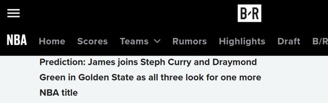 美媒Bleacher Report表示,如果詹姆斯不回归湖人,勇士将是他最有可能的下家。该媒体预测詹姆斯加盟勇士,与库里、追梦联手,三人共同冲击又一座总冠军奖杯。
