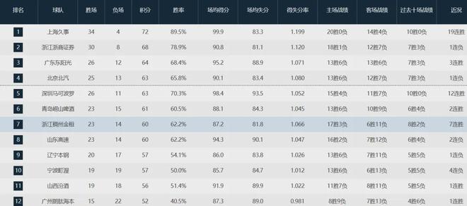 本场比赛过后,上海队战绩来到34胜4负,领先第二的卫冕冠军4个胜场,由于本赛季常规赛仅剩4场,那么广厦队顶多可以追平战绩;此外,因为两队交手战绩持平(1胜1负),且上海队潜力赛战绩排名高于广厦队,所以上海队已经提前锁定常规赛冠军。