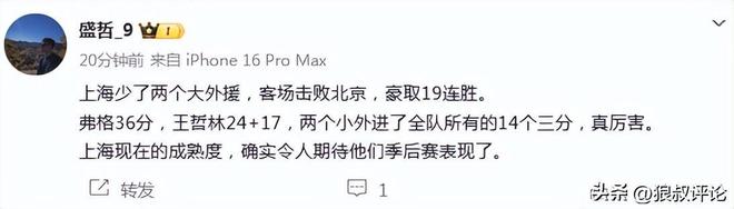 今天上海只有俩小外,俩人打满前三节,弗格狂砍36分,王哲林面对拥有周琦和麦基的北京拿到24分17篮板(得分赛季第2高,篮板新高,9记前板新高),同时自己的CBA生涯总分也超越刘炜,升至历史第5。