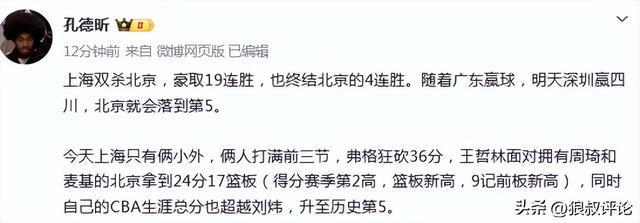 上海双杀北京,豪取19连胜,也终结北京的4连胜。随着广东赢球,明天深圳赢四川,北京就会落到第5。