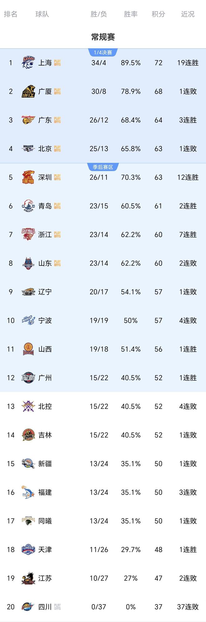 CBA疯狂一夜:上海战胜北京夺19连胜,广厦又输广东,排名变乱了