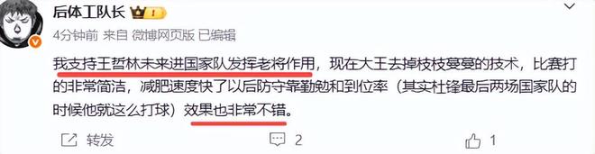 而今天媒体人“后体工队长”也认同了球迷的看法,他在社媒表达了他的观点,力主王哲林再进国家队发挥老将作用,他说“我支持王哲林未来进国家队发挥老将作用,现在大王去掉枝枝蔓蔓的技术,比赛打的非常简洁,减肥速度快了以后防守靠勤勉和到位率(其实杜锋最后两场国家队的时候他就这么打球)效果也非常不错"。说得没错,他4年前跟随杜锋为中国男篮打进世界杯立了功,打得非常硬朗和努力。他的机动性也非常强,投篮命中率高达66.8%,三分命中率高达57%,这是我国国内中锋所不具备的命中率和机动性。昔日罚球短板也有所改进,罚球命中率已不再只是四五成了,而是达到场均66.4%。无论从进攻效率还是机动性来看,王哲林目前依然是CBA的一流中锋。