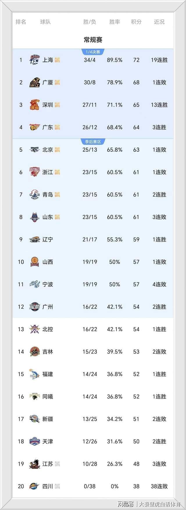 随着本轮比赛的结束,CBA最新排名又变了: