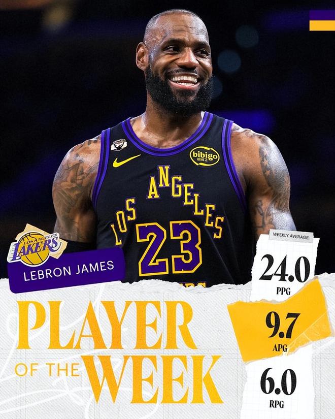 詹姆斯当选常规赛最后一周西部周最佳球员,他场均贡献24.0分、9.7次助攻和6.0个篮板,带领球队在缺少另外两大核心的情况下拿下胜绩。