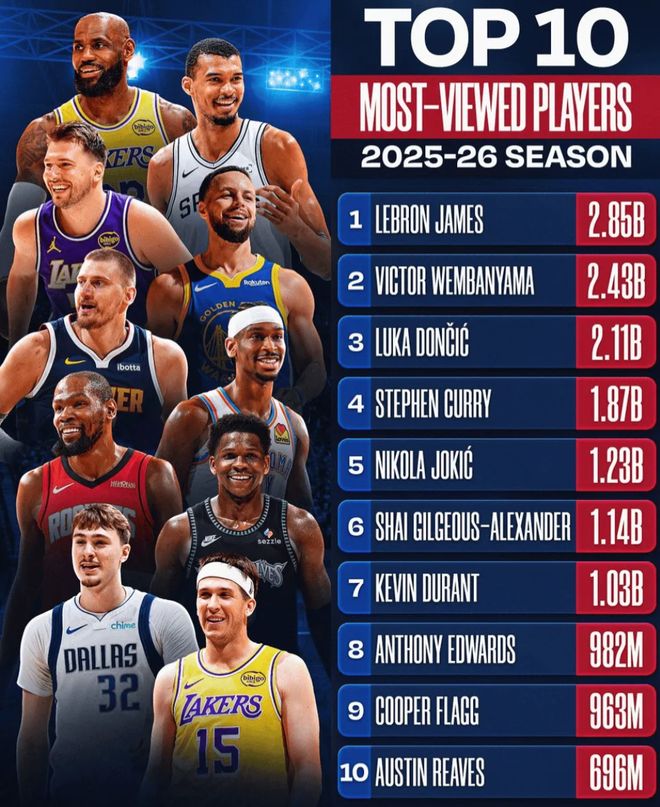 6.41岁的勒布朗社媒播放量28.5亿排第一,证明41岁的勒布朗依旧是联盟门面;