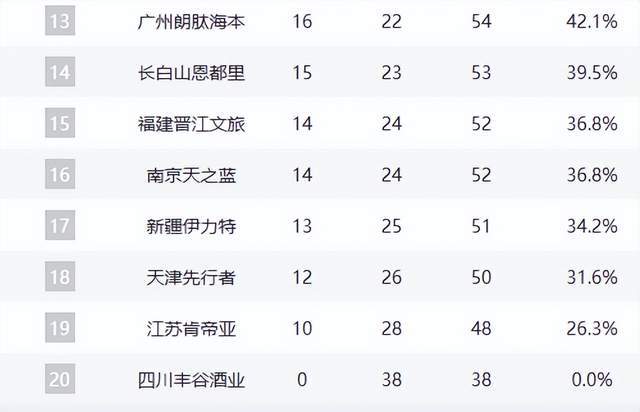 北控队与广州队均以16胜22负并列第十二、十三,成为季后赛“守门员”。吉林队15胜23负,落后两队1个胜场,仍保留理论逆袭可能。福建队与同曦队14胜24负,尚存微弱希望。新疆队仅剩数学意义上的晋级可能。
