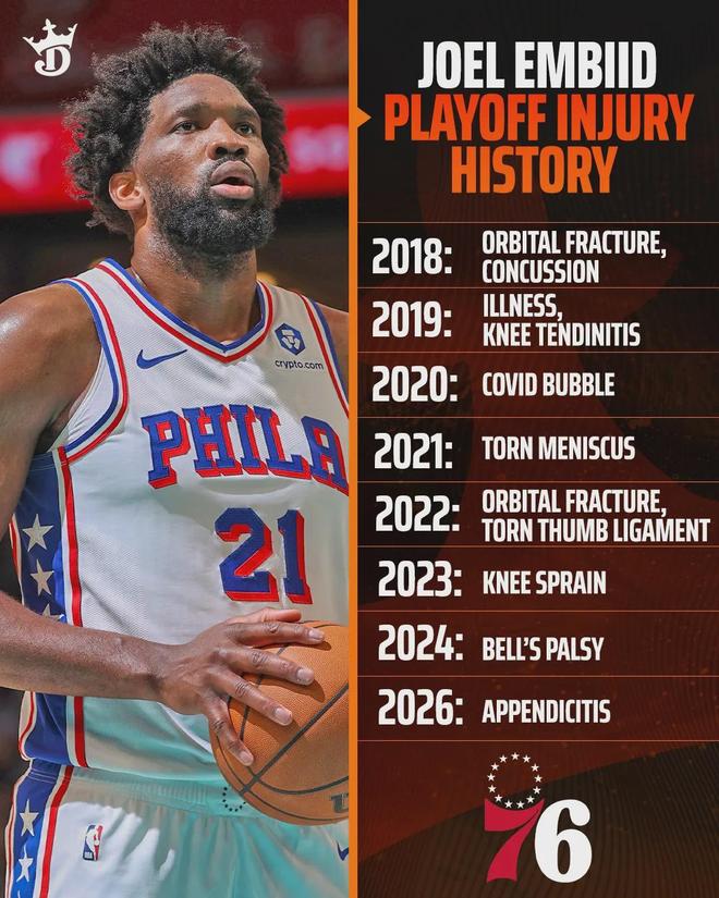 过去几年,恩比德先后经历过:眼眶骨折+脑震荡、膝盖肌腱炎、半月板撕裂、拇指韧带撕裂、膝盖外侧副韧带扭伤、面瘫、阑尾炎……最近三个赛季,恩比德分别出战39场、19场和38场常规赛,三年加起来不够100场,真的扎心了!