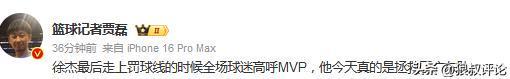 广东男篮本场杜锋缺阵、胡明轩伤停,首节16-26落后10分,最多落后15分。徐杰毫无疑问是扛起球队大旗的核心,上半场得到17分,末节打中关键的2+1,获得现场球迷高呼MVP的待遇。