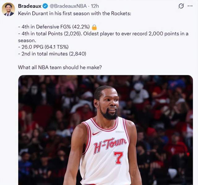 “杜兰特加盟火箭的第一个赛季,对手面对他的防守命中率只有42.2%,位居联盟第四;而本赛季总得分来到2026分,同样排名联盟第四。总出场时间2840分钟,高居联盟第二,也是NBA历史上单赛季突破2000分的最年长球员。”