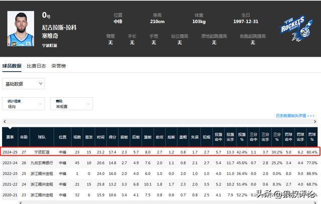 尼古拉斯-拉科塞维奇的职业生涯,从来不是一个大包大揽的顶级大外援,但2米10以上的身高,还有一定的三分球投篮威胁,以及能保护篮板球的特点,与这一支广东男篮特点比较吻合。包括24-25赛季,尼古拉斯-拉科塞维奇代表宁波效力期间,场均23分钟也能交出17.4分8篮板,场均2.3个前场篮板球成为主要的亮点。