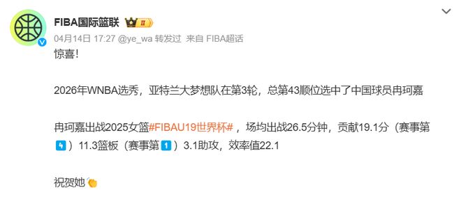 就在球迷们为冉珂嘉的落选感到惋惜和不平之时,戏剧性的一幕在4月14日的WNBA选秀大会上上演了。亚特兰大梦想队在第三轮总第43顺位,毫不犹豫地选中了这位刚刚被中国国家队弃用的19岁小将,让她成为继郑海霞(1997年洛杉矶火花,第二轮第16顺位)、韩旭(2019年纽约自由人,第二轮第14顺位)和李月汝(2019年亚特兰大梦想,第三轮第35顺位)之后,中国女篮历史上第四位通过选秀登陆WNBA的球员,更是首位以外线球员身份获此殊荣的中国女篮队员。