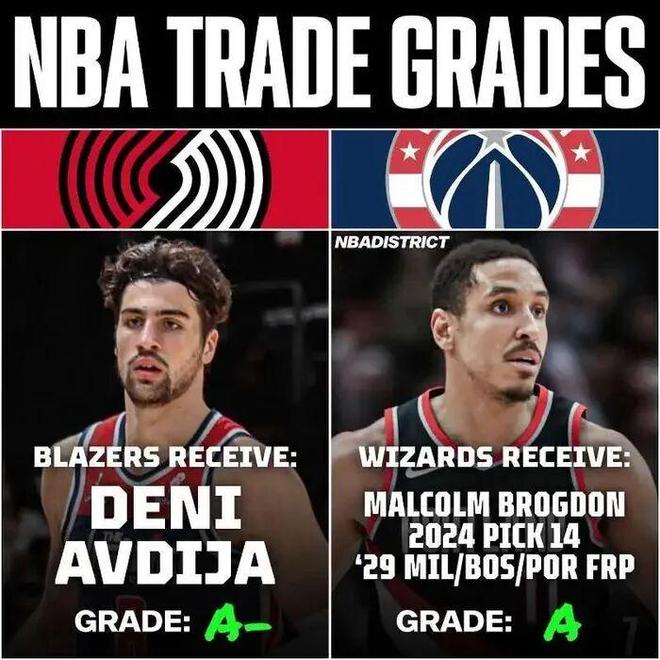 2024年夏天,开拓者送出布罗格登+首轮第14号秀卡林顿+29年首轮签+2个次轮签,以此从奇才挖来阿夫迪亚。