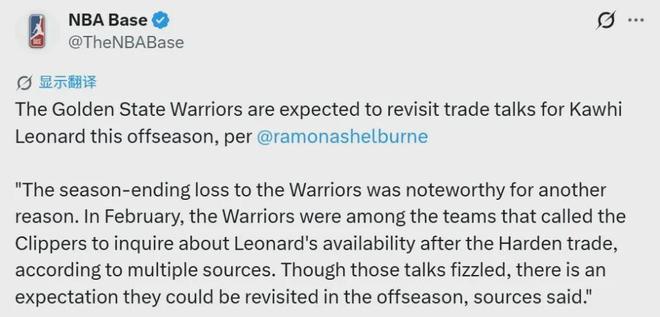 近日ESPN名记Shelburne透露,今年交易截止日前看到快船将哈登送去骑士,勇士就想挖伦纳德无奈当时的谈判没有成功,然而勇士并没有因此放弃追求伦纳德,今夏休赛期可能会再次与快船展开谈判。