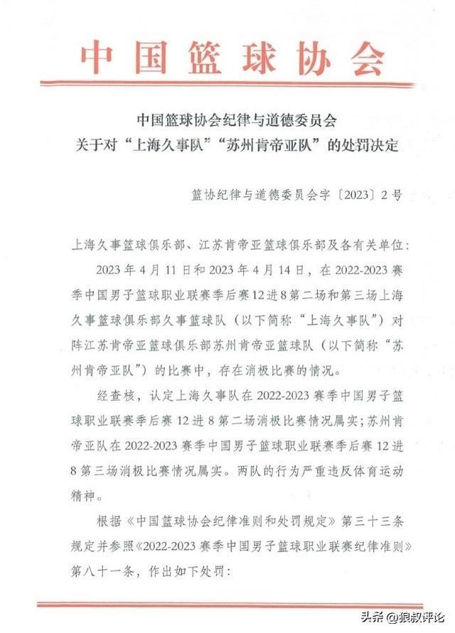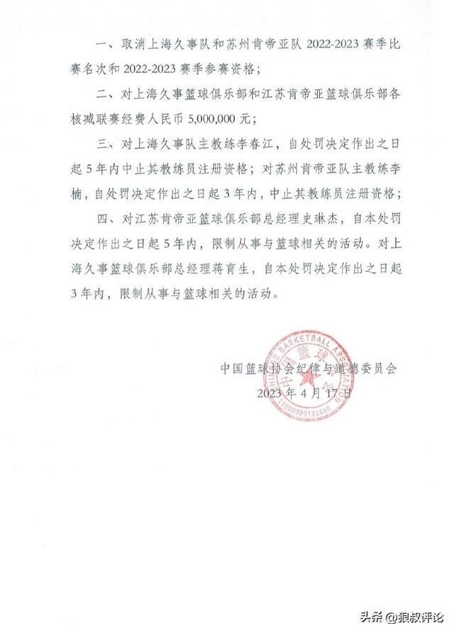 3、江苏男篮总经理史琳杰自今日起,限制从事与篮球相关的活动5年!上海总经理蒋育生限制从事与篮球相关的活动3年。