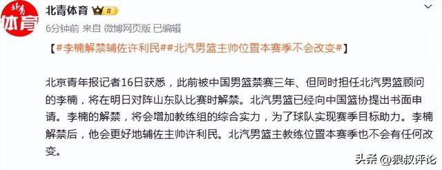 随后有知情媒体报道,北京首钢队主教练位置本赛季不会有任何改变。李楠解禁后,会增加教练组的实力,帮助球队更好地实现赛季目标。