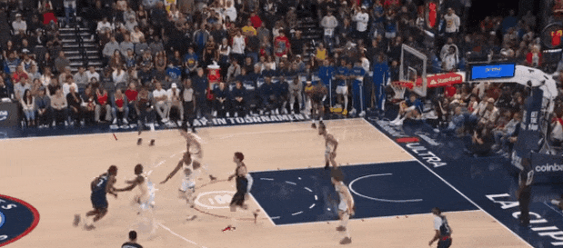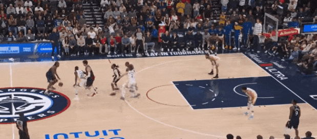 比如,莱纳德过三分线,追梦半场等他;莱纳德试图叫邓恩挡拆,库里做了一个延阻返位,追梦急速挤过掩护,逼得莱纳德停球。