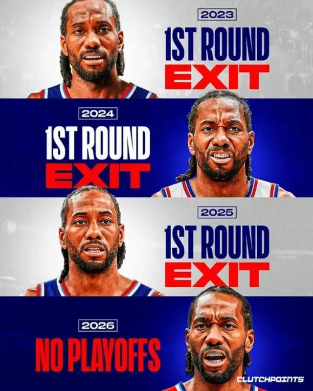 这些年,快船已经为伦纳德尝试了多种排列组合,但快船战绩始终没有起色。2022年附加赛,排名第8的快船连输两场出局,随后三年连续首轮游,今年快船附加赛第一轮就出局,队史三场附加赛全败。
