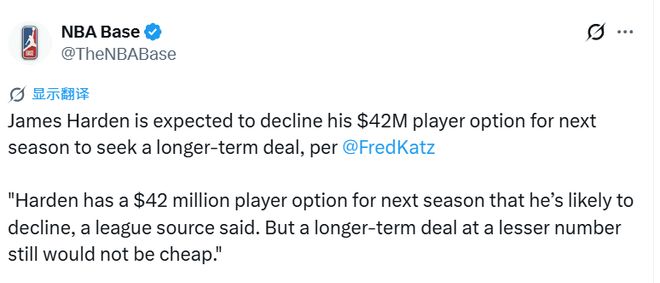 北京时间4月17日,据The Athletic(TA)报道,联盟消息人士透露:哈登下赛季拥有4200万美元球员选项,他大概率会选择跳出。即便后续签下一份年薪更低的长期合同,薪资总价依旧不菲。