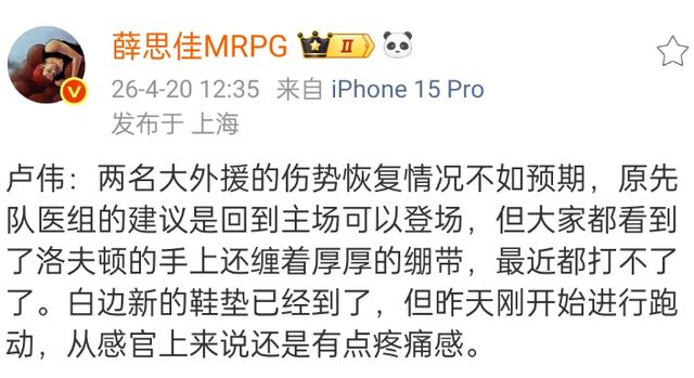 上海男篮拿到了常规赛冠军,然而卢伟却高兴不起来,因为内线两位外援洛夫顿和怀特塞德都出现了伤病情况,主场和辽宁男篮比赛之前,卢伟介绍了两位外援的情况,他表示洛夫顿的情况不乐观,短期内无法出战,常规赛确定报销,季后赛第一轮能否回归也不确定。
