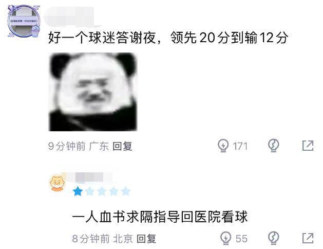 杜锋对于皮特森这一点的防守,确实是相当失败的,球迷也热议道:“好一个球迷答谢夜,领先20分到输12分”、“一人血书,求隔指导回医院看球”。