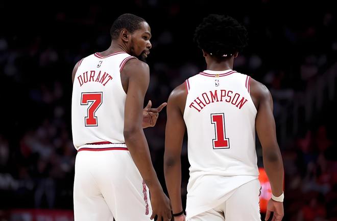 开局阶段双方缠斗激烈,杜兰特甫一上阵便开启得分模式,中距离干拔稳准狠,罚球线也保持高命中率,单节高效斩获11分,一度助火箭紧咬比分。然而除他之外,全队进攻陷入沉寂:申京篮下强攻屡屡受阻,小史密斯外线尝试频频打铁,三分线外12投仅2中,进攻端严重依赖单点输出。