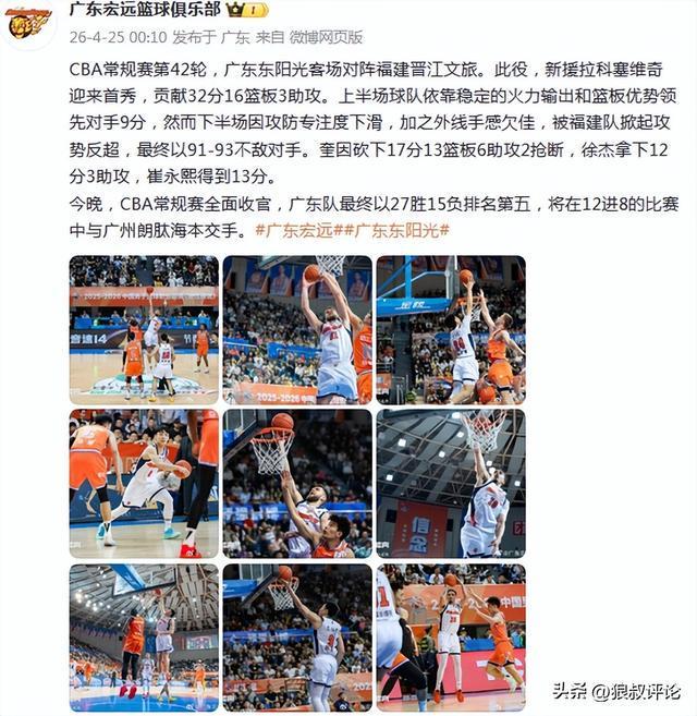CBA常规赛收官战,广东客场93-93不敌福建,历史上首次赛季遭到对手双杀。