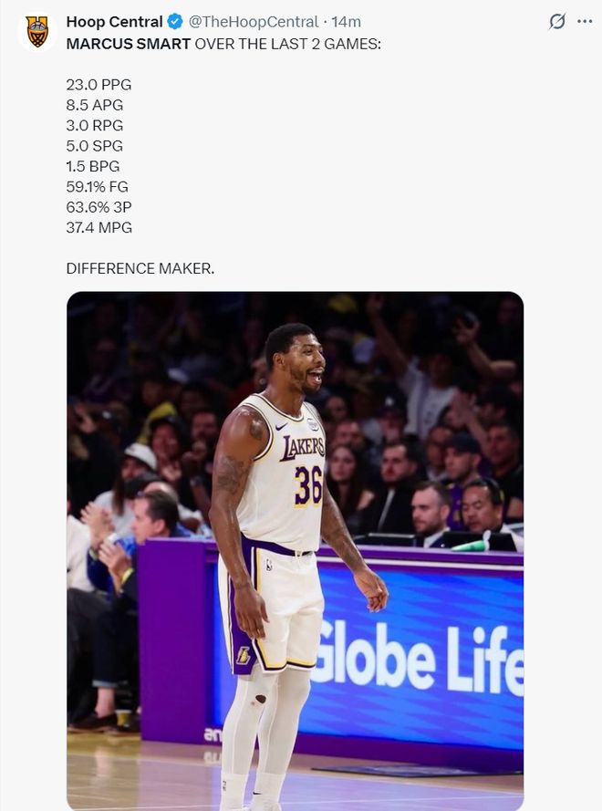 这场比赛湖人的赢球海报中心是马库斯-斯玛特,没错,又是缸哥,他上一场就是赢球第一功臣,他在末节与加时赛的表现实在是太出色了。