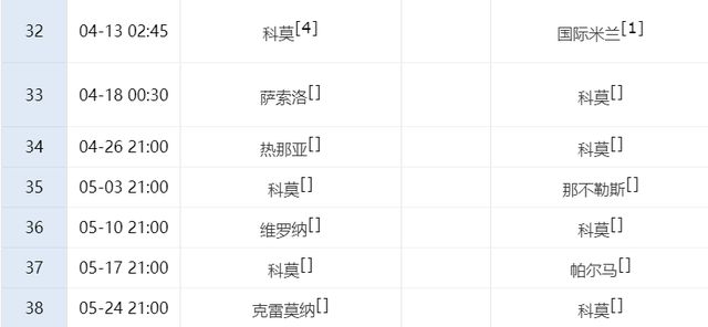 下一轮比赛,科莫就将在主场对阵国米,之后第35轮,他们还将在主场迎战那不勒斯,这2场比赛的结果,将决定科莫的命运。作为本赛季意甲大黑马,科莫的表现给球迷带来了很大的惊喜,不过如果输掉这2场恶战,他们很可能无缘前四。