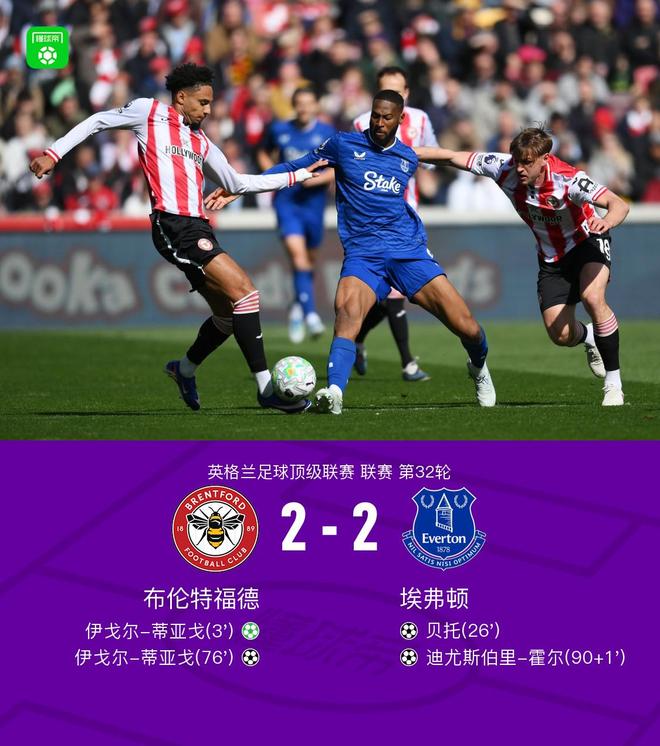 北京时间4月11日22:00,英超第32轮,布伦特福德主场对阵埃弗顿。上半场,皮克福德铲倒沙德被判罚点球,伊戈尔-蒂亚戈点射命中,布兰斯韦特远射打偏,贝托头球扳平比分。下半场,内森-科林斯头球攻门击中门框,卡约德射门打在伊戈尔-蒂亚戈身上弹进球门,霍尔补时抽射绝平,最终,布伦特福德2-2埃弗顿遭联赛4连平。