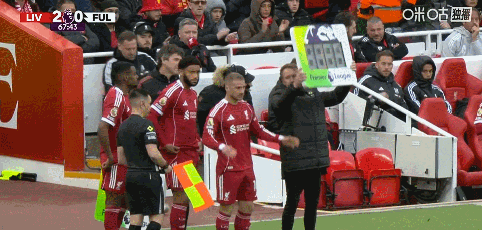 第69分钟,利物浦连换三人,伊萨克、戈麦斯、麦克利斯特替补登场