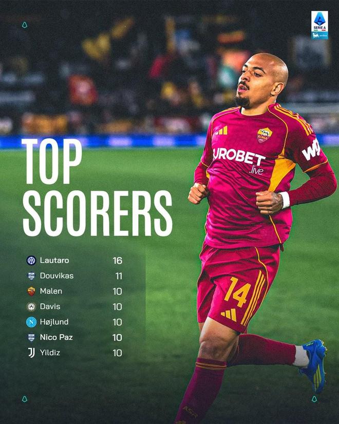 此役主场对阵比萨,马伦完成意甲生涯首次帽子戏法。至此,这位荷兰前锋自冬窗加盟以来在意甲出场12次已打入10球,这使得他在意甲射手榜上与霍伊伦、尼科-帕斯、伊尔迪兹、凯南-戴维斯等人并列第三,仅次于打入16球的劳塔罗和打入11球的杜维卡斯。