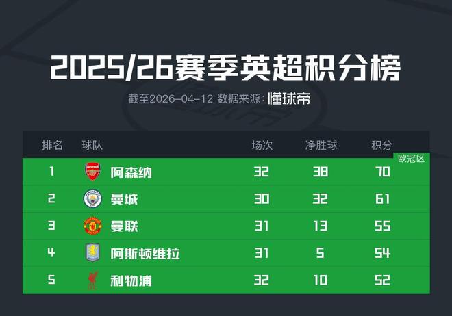 五大联赛争冠形势:阿森纳多赛2场领先9分,拜仁最快下轮夺冠
