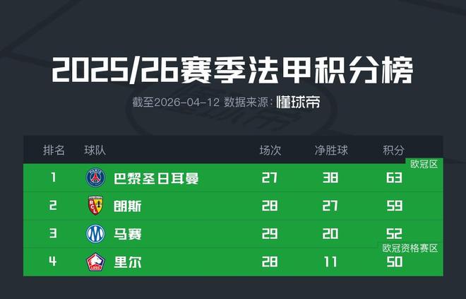 法甲是目前五大联赛里一二名积分最接近的,排名第一的大巴黎少赛一场领先第二朗斯4分。