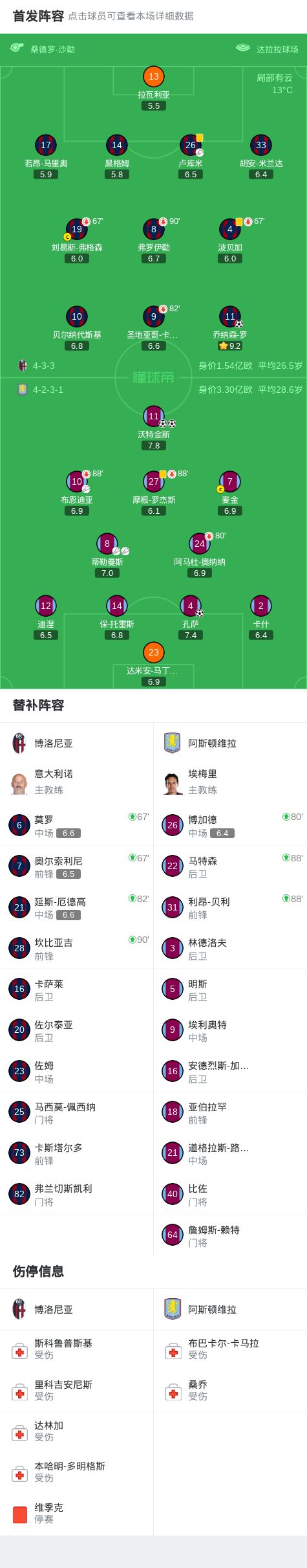 第44分钟,蒂勒曼斯助攻,孔萨头球破门,博洛尼亚0-1维拉