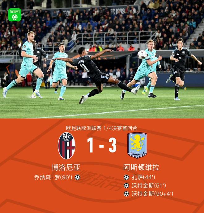 北京时间4月10日欧足联欧洲联赛 1/4决赛首回合,博洛尼亚对阵阿斯顿维拉。上半场孔萨首开记录,下半场沃特金斯破门扩大比分,90分钟乔纳森-罗扳回一球,随后沃特金斯破门梅开二度。最终比分博洛尼亚 1-3 阿斯顿维拉。