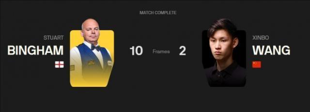 斯诺克世锦赛80进48轮次,王信伯2比10不敌宾汉姆,无缘48强。宾汉姆打出2杆破百和7杆50+,王信伯打出2杆50+。本场比赛,宾汉姆一上来送出9连鞭,以9比0领先王信伯,随后王信伯连追2局,最终2比10不敌宾汉姆。