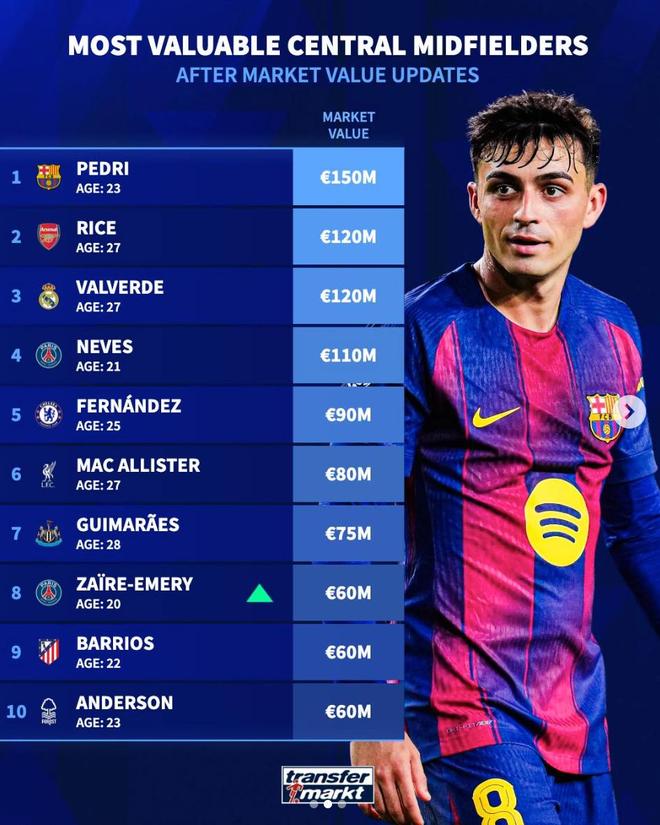 北京时间4月12日,德转列出了世界足坛中前卫球员身价前10,巴塞罗那的佩德里以1.5亿欧元高居第一,阿森纳的赖斯和皇家马德里的巴尔韦德同以1.2亿欧元并列第二。