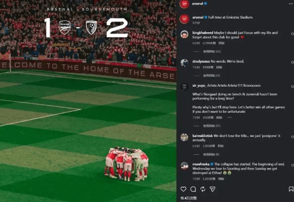 领先 9 分也翻车!阿森纳主场 1-2 输伯恩茅斯,球迷官推集体破防