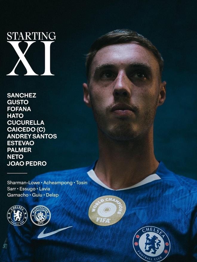 切尔西首发:1-罗伯特-桑切斯、27-古斯托、29-福法纳、21-哈托、3-库库雷利亚、25-凯塞多、17-安德雷-桑托斯、10-帕尔默、41-埃斯特旺、7-佩德罗-内托、20-若昂-佩德罗