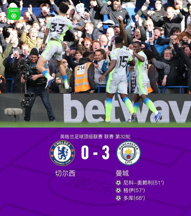 北京时间4月12日23:30,英超第32轮焦点战,切尔西坐镇斯坦福桥球场迎战曼城,本场主裁判为克里斯-卡瓦纳。上半场,库库雷利亚进球越位无效。下半场,谢尔基分别助攻奥赖利和格伊破门,多库抢断凯塞多后打入一球。最终,曼城客场3-0完胜切尔西,少赛1场距榜首阿森纳6分。