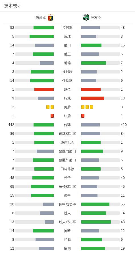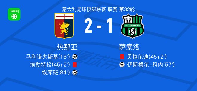北京时间4月12日意大利足球甲级联赛第32轮,热那亚主场对阵萨索洛。 比赛中,热那亚球员率先取得进球,随后两队各有球员在半场结束阶段被红牌罚下。易边再战,萨索洛球员扳回一球,热那亚球员之后再入一球锁定优势。 最终比分热那亚2-1萨索洛。