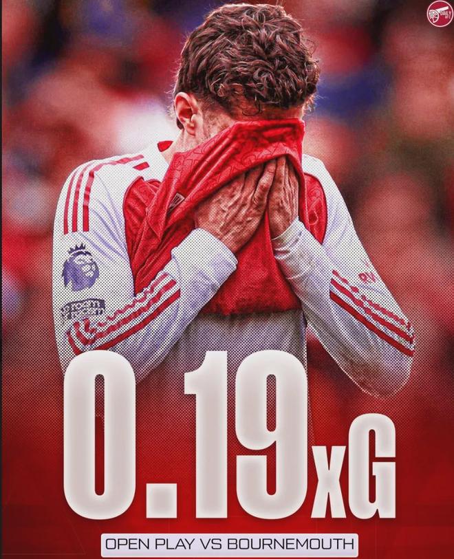 根据天空体育统计,阿森纳在不敌伯恩茅斯的比赛中运动战预期进球只有0.19,是枪手在英超比赛中第二低的预期进球数。