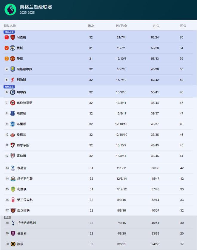 阿森纳在32轮联赛过后,战绩是21胜7平4负,积70分,排名联赛第一。他们一共打入了62个进球,丢了24个球,净胜球是38个。
