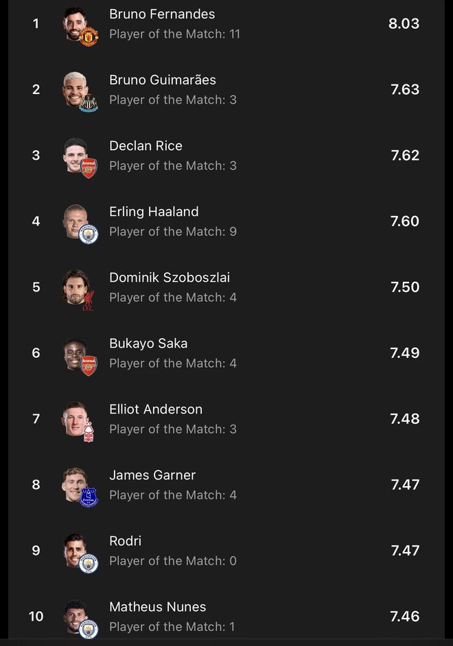 WhoScored的赛季评分榜更新了,英超最高分的球员名单里,有几个名字让球迷挠头。利物浦的萨拉赫以7.94分领跑,这倒不意外——他本赛季直接参与进球数已经追平个人英超纪录。但往下看,阿森纳的萨卡、纽卡的伊萨克、甚至布莱顿的三笘薰都挤进了前十,而某些豪门核心却集体失踪。